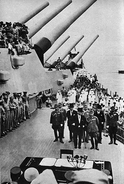 The Japanese signing the act of surrender on board the USS Missouri on Septemnber 2nd, 1945, marking the end of World War II.